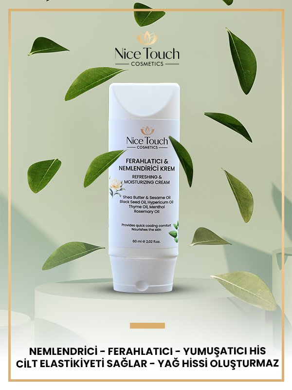 Cildinize anında ferahlık ve yoğun nem desteği! Shea Butter, Susam Yağı, Çörek Otu, Sarı Kantaron, Kekik, Biberiye ve Mentol içeren Nice Touch Ferahlatıcı & Nemlendirici Krem; cildinizi besler, onarır ve serinletici etkisiyle gün boyu tazelik sağlar. Hafif yapısı sayesinde hızlı